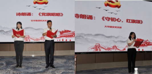 第二個(gè)節(jié)目是由地產(chǎn)公司黨支部帶來(lái)的詩(shī)歌朗誦《黨旗昭昭》詩(shī)詞充滿力量,宋鵬飛、張宇二位同志用充滿磁性的聲音帶領(lǐng)我們回顧歷史,展望未來(lái)。