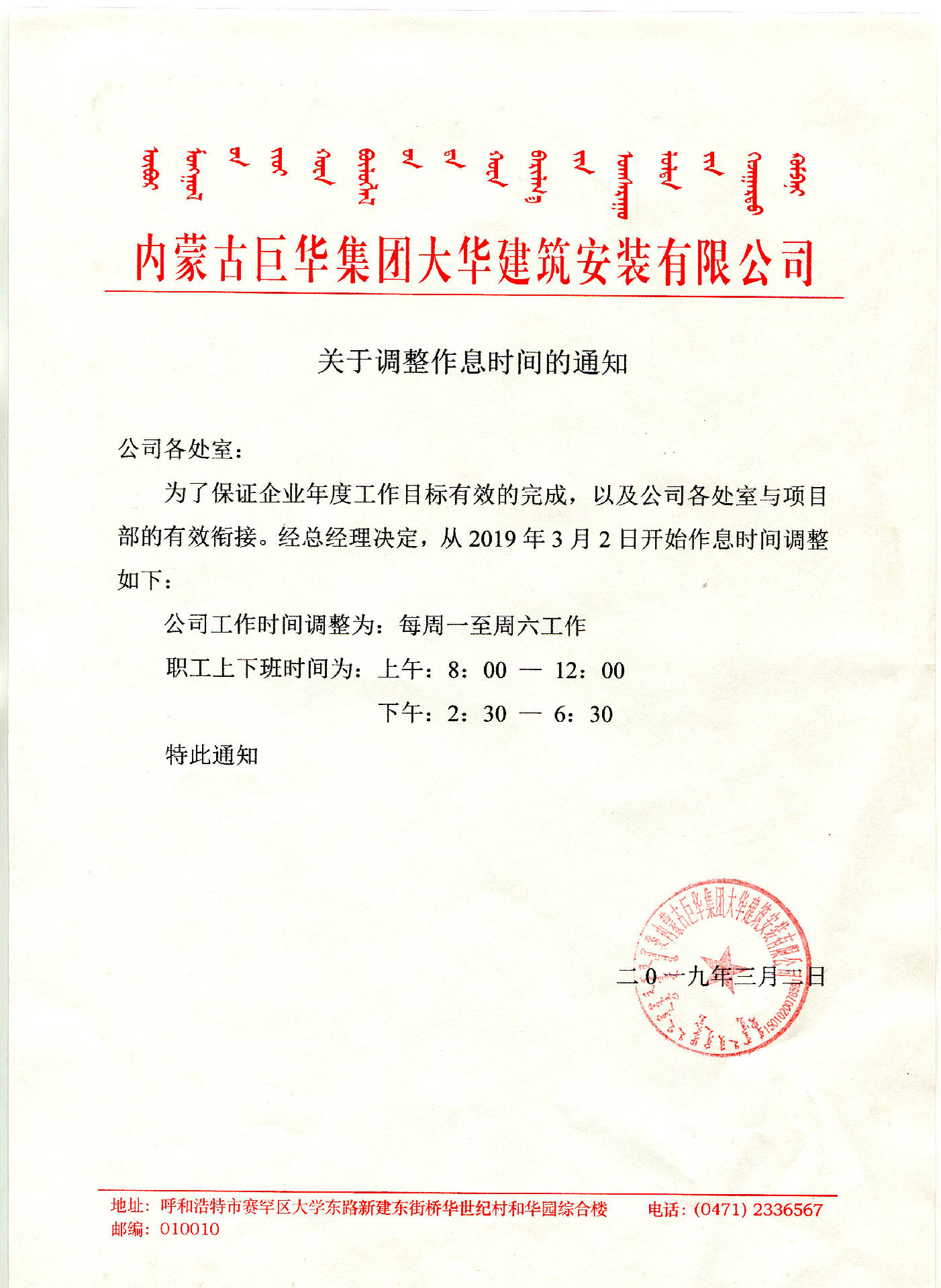 為了保證企業(yè)年度工作目標(biāo)有效的完成,以及公司各處室與項(xiàng)目部的有效銜接。經(jīng)總經(jīng)理決定,從2019年3月2日開(kāi)始作息時(shí)間調(diào)整如下:
