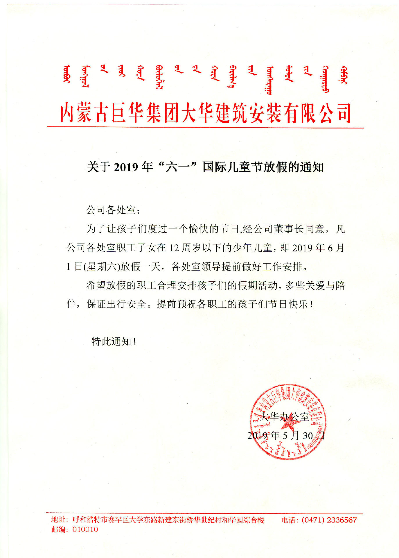 為了讓孩子們度過一個愉快的節日,經公司董事長同意,凡公司各處室職工子女在12周歲以下的少年兒童,即2019年6月1日(星期六)放假一天,各處室領導提前做好工作安排。